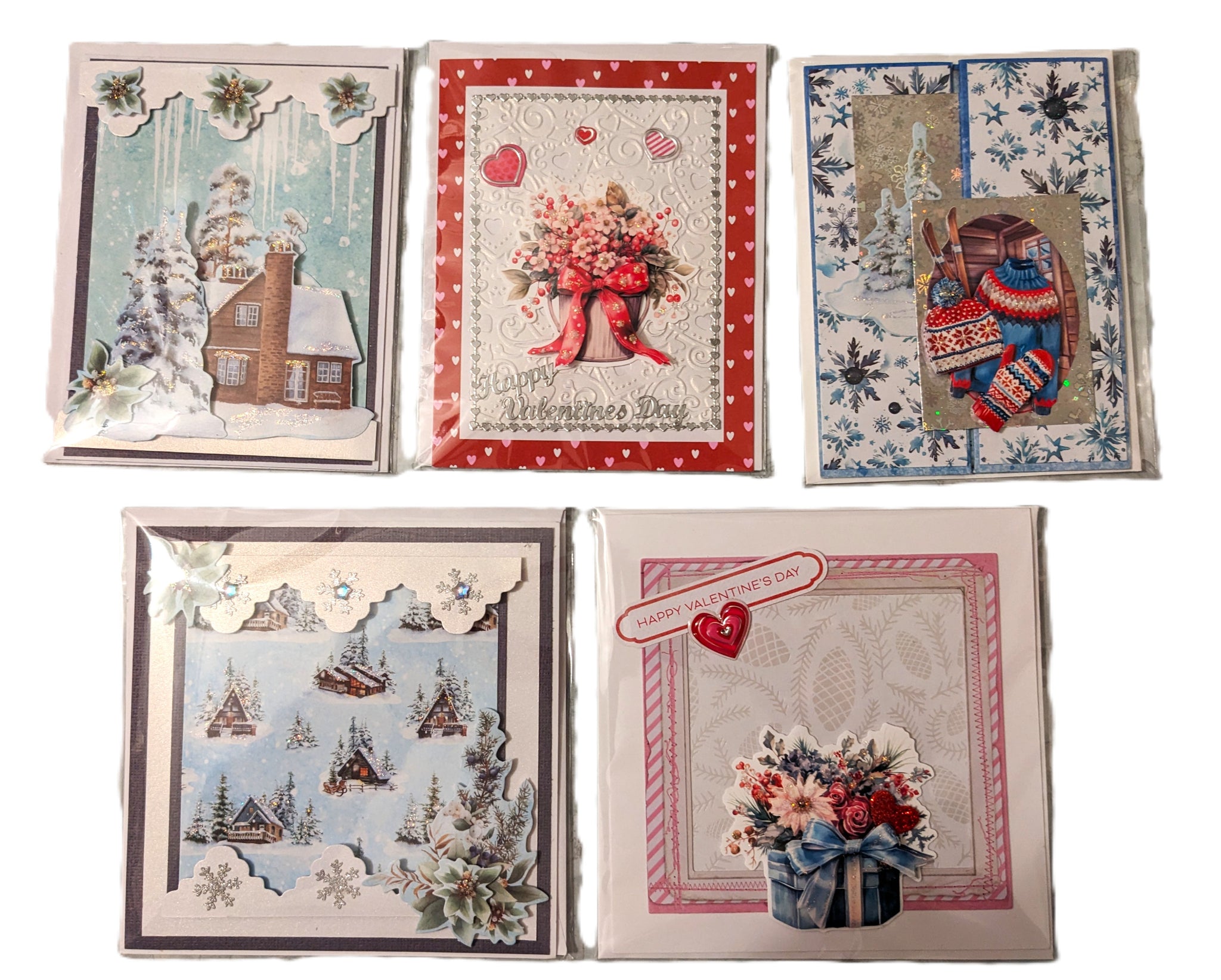I am offering this collection pack of five Winter and Valentine's Day greeting cards in different sizes, decorated with designer paper, card toppers, bling and glitter.